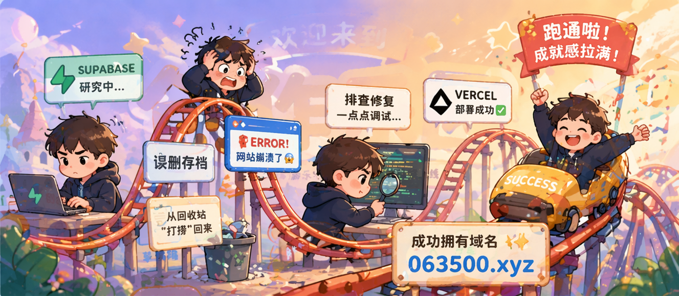 这一个星期过得简直像坐过山车。从研究 Supabase 后台到搞定 Vercel 部署,中间差点没把心态搞崩。最惊险的是不小心误删了存档,硬是从回收站里给“打捞”回来的;还有好几次手欠把网站改到彻底崩溃,只能对着屏幕一点点排查修复。虽然过程很“秃”然,但最后跑通的那一刻,成就感真的直接拉满!并且购买到063500.xyz这个域名也是非常满意。